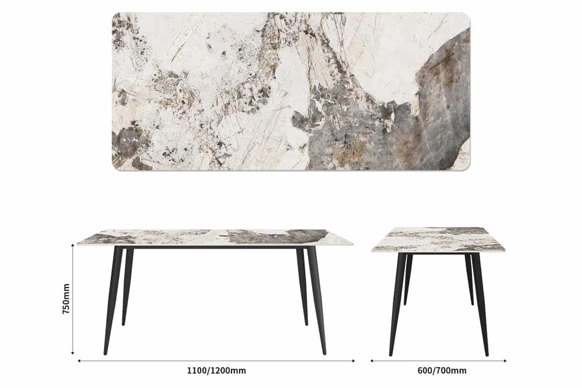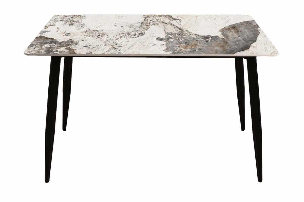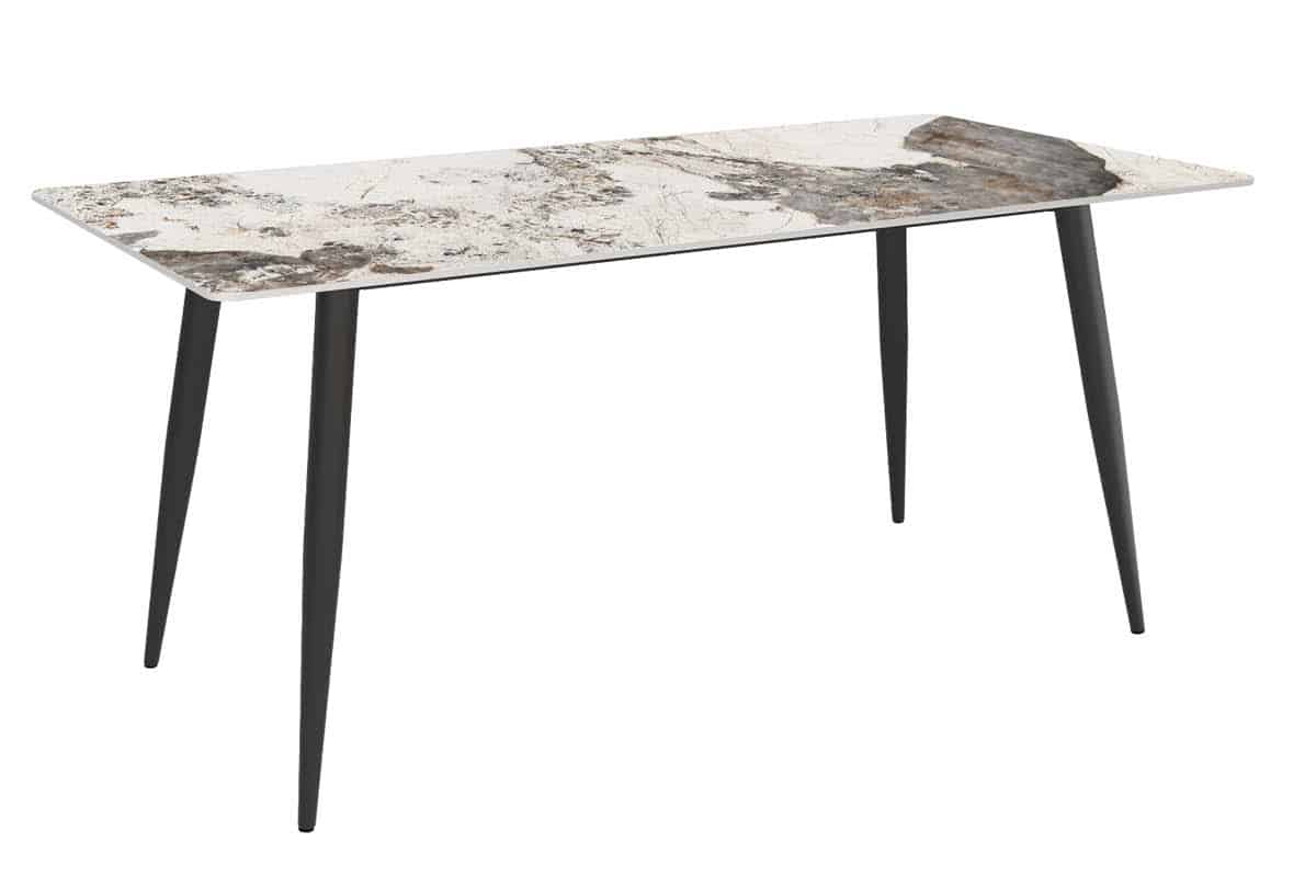 שולחן אוכל מרשים בעיצוב מינימליסטי ונקי, המשלב בין מראה טבעי של שיש בהיר לבין רגלי מתכת שחורות דקיקות.