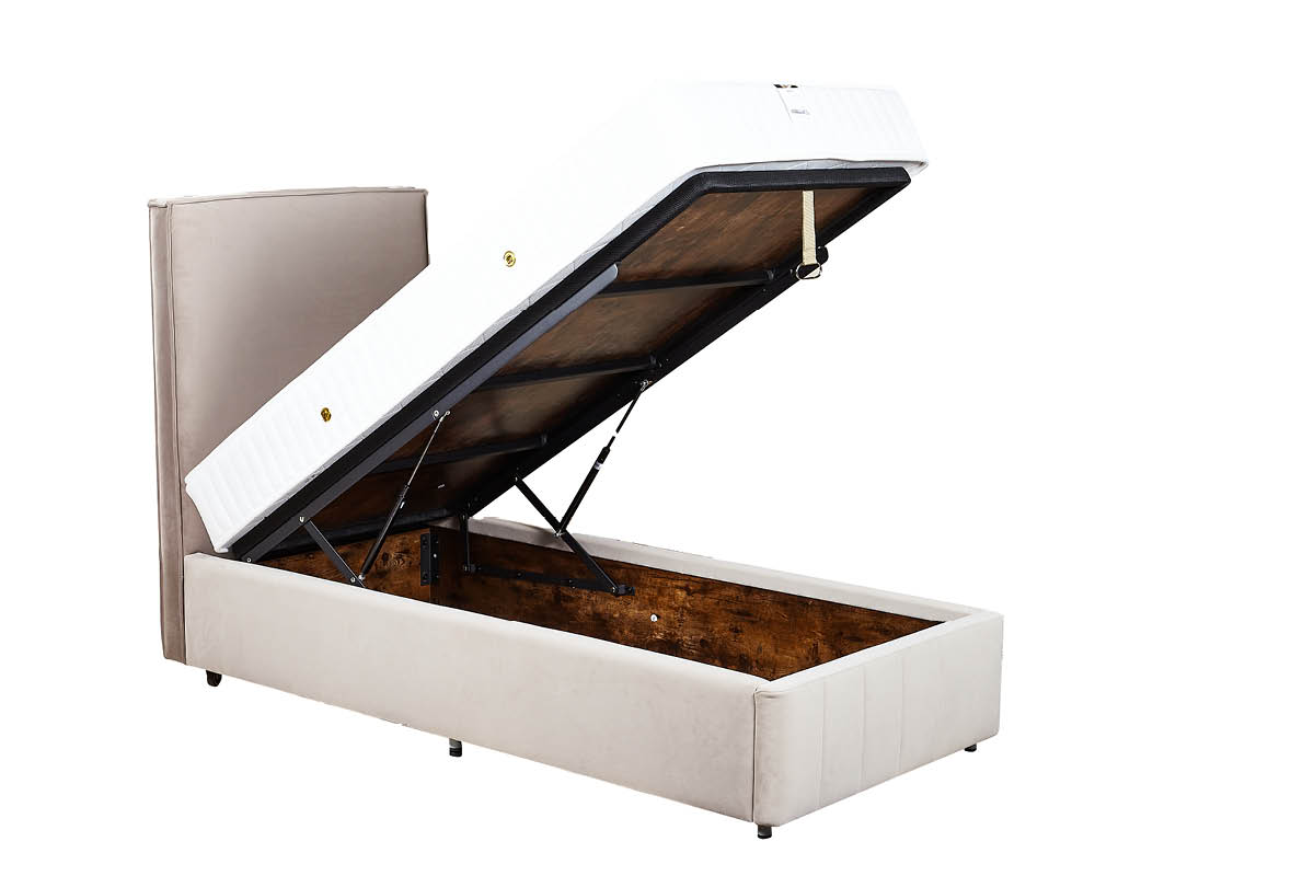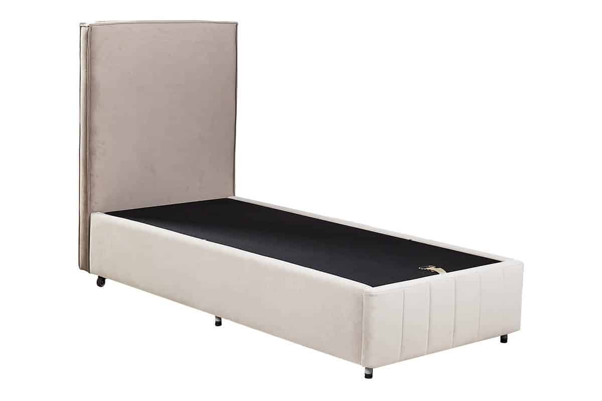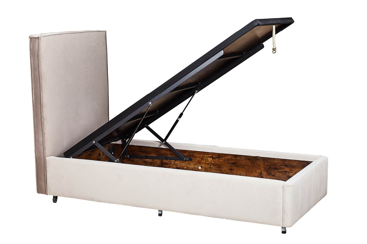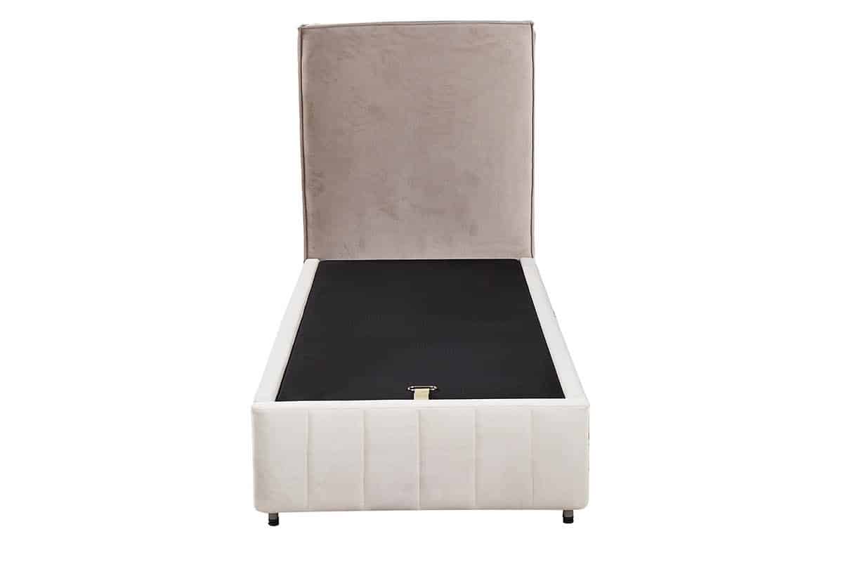 מיטת אחסון מרופדת בעיצוב מודרני עם קווים נקיים וראש מיטה גבוה, ישר ורך.