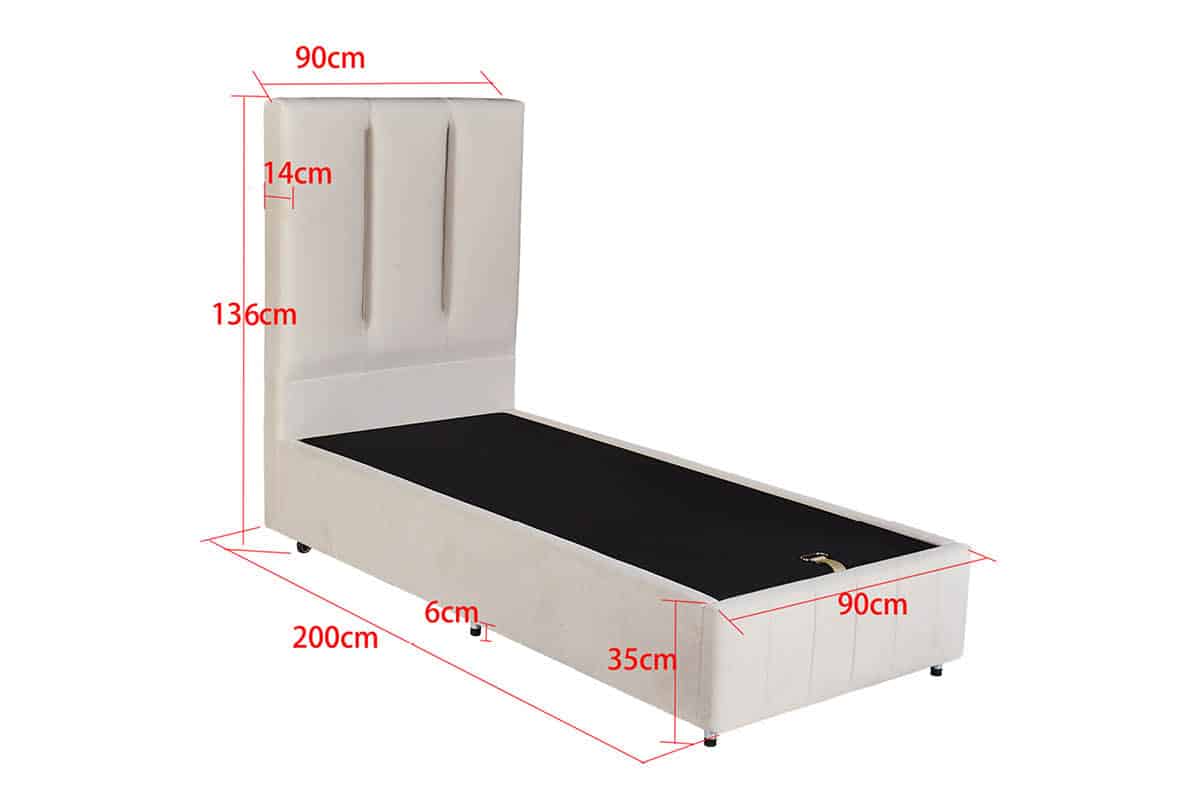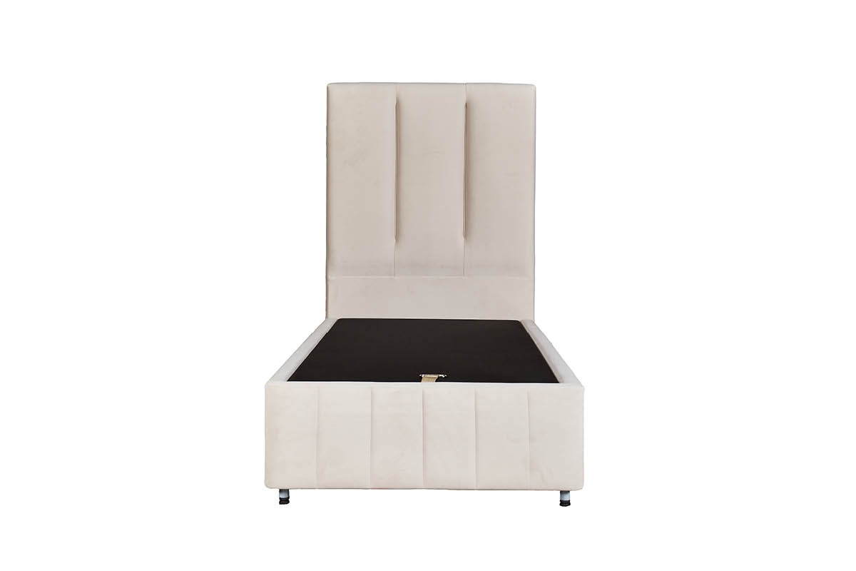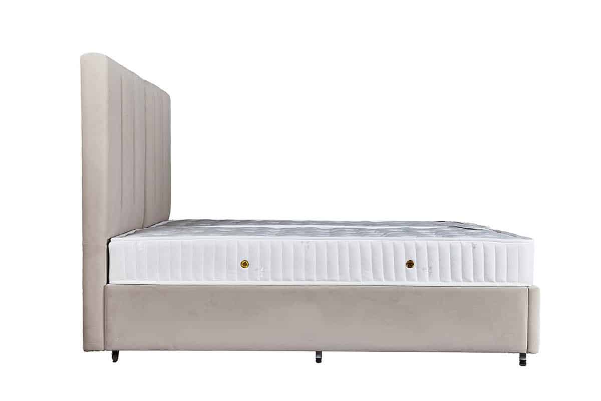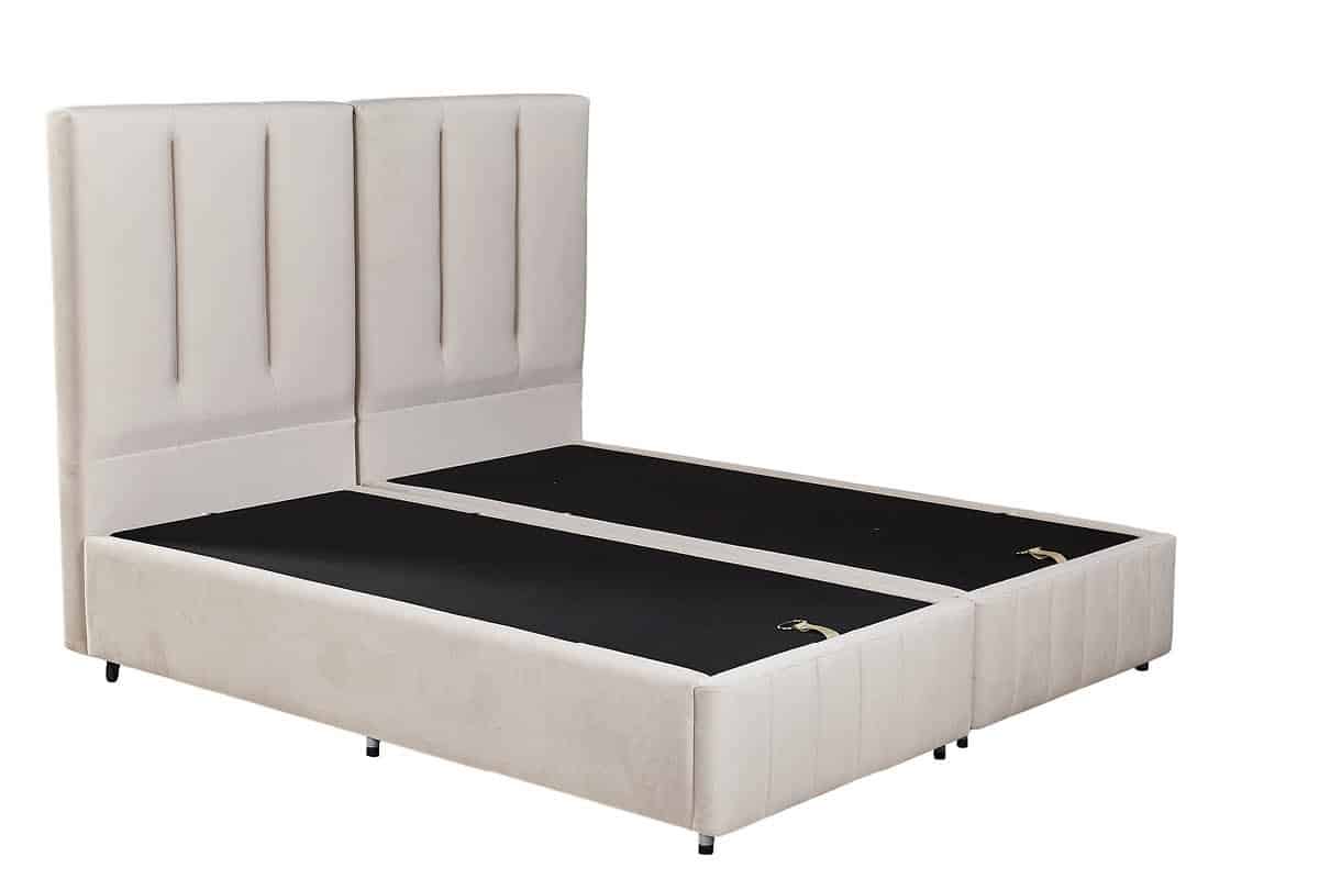 • בסיס המיטה בנוי מארגז עץ רחב ועמוק, שמצופה בבד קטיפה או דמוי זמש בגוון בהיר.